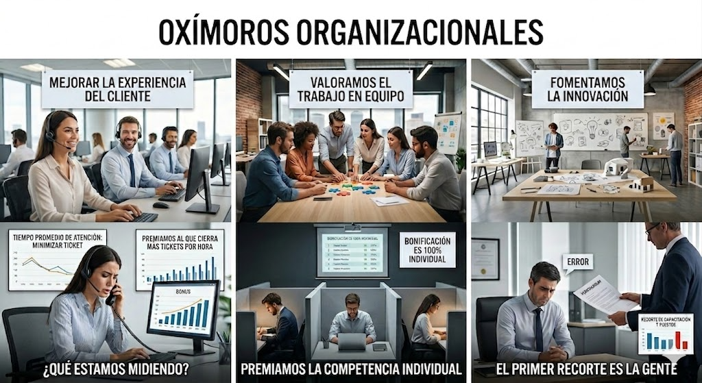 Pero hay algo todavía más profundo en estas reflexiones: van emergiendo los oxímoros organizacionales. Esas contradicciones que habitan cómodamente en nuestras estrategias sin que nadie las cuestione.